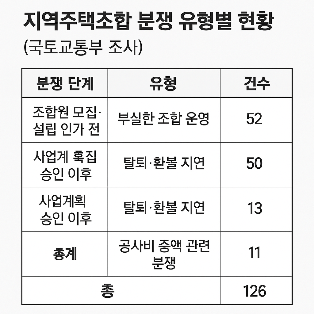 국토부 조사에 따르면, 전체 지주택의 약 30%에서 290건 이상 분쟁이 발생했고, 서울, 경기, 광주에 집중되어 있습니다.